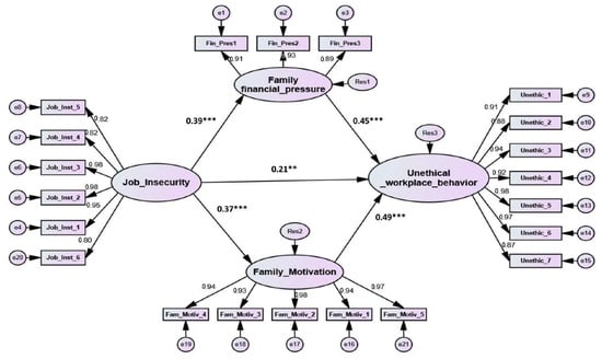 | H7 | Job insecurity Family motivation Unethical workplace behavior | Path 1: β = 0.37 ***; t-value = 10.444 Path 2: β = 0.49 ***; t-value = 15.702 | Supported | ||||