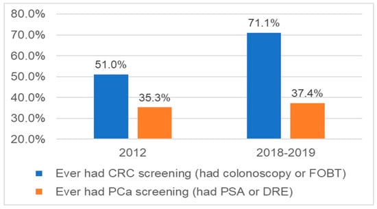 - Fedewa, S.A.; Sauer, A.G.; Siegel, R.L.; Jemal, A. Prevalence of major risk factors and use of screening tests for cancer in the United States. Cancer Epidemiol. Biomark. Prev. 2015, 24, 637–652. [Google Scholar] [CrossRef]