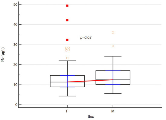 Lead levels with regard to sex. Medians and IQRs are shown. Empty dots represent individual data. Red squares are outliers.