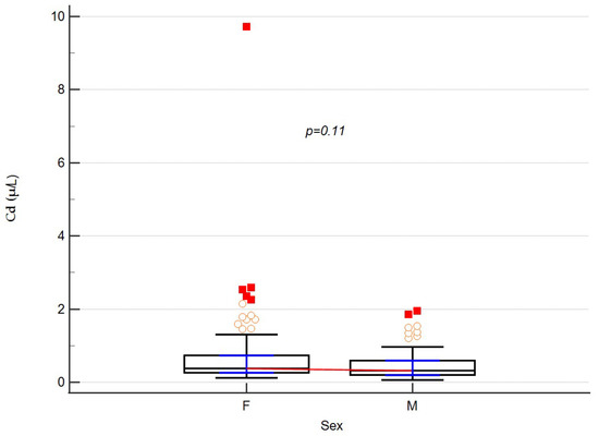 Cadmium levels with regard to sex. Medians and IQRs are shown. Empty dots represent individual data. Red squares are outliers.