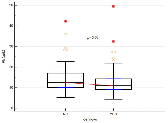 Levels of lead with regard to disease onset. Empty dots represent individual data. Red squares are outliers.