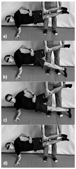 The Copenhagen adductor exercise: (a) starting position, (b) the eccentric femoral abduction phase (lower leg), (c) the eccentric pelvic on femoral abduction phase (upper leg), (d) the concentric pelvic on femoral adduction phase (lower leg) (Adapted from Schaber et al. [35]).