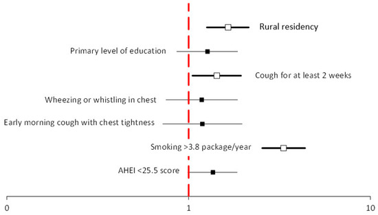 The percentage of current smokers was higher in rural than urban residents (25.1% vs. 16.8% in the baseline study and 20.7 vs. 14.0% in the follow-up period, respectively). Only for rural residents was there a statistically significant increase in the percentage of former smokers (24.8% in the baseline study vs. 30.6% in the follow-up period) (Table 2). Living in rural area independently increased the likelihood of being a current smoker by more than 1.5 times (OR = 1.65 CI = 1.26–2.14) (Figure 2). In the univariate logistic regression analysis, rural residency decreased the likelihood of being a former smoker (OR = 0.70 CI = 0.57–0.86) (Table 4).