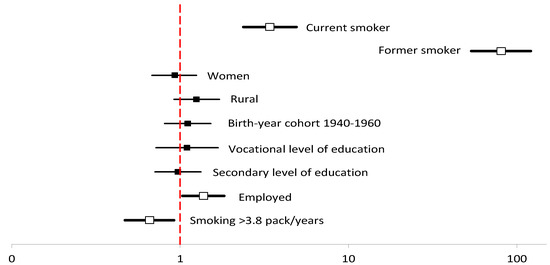 There was a statistically significant, 3.5% decrease in current smokers during the period under analysis (from 20.2% in the baseline study to 16.7% in the 9-year follow-up period). In the baseline study, there were 20.2% current smokers, 31.5% former smokers, and 48.3% of never-smokers. After the 9-year follow-up period, the percentage of current smokers decreased to 16.7%, former smokers increased to 45.4%, and never-smokers decreased slightly to 47.9% (Table 2). Participants whose pack-years were ≥3.8 had over 3-fold higher risk (odds ratio (OR) = 3.36; confidence interval (CI) 2.59–4.40), and those who declared tobacco smoking in the baseline study were 75 times more likely to be current smokers in the 9-year follow-up period (OR = 75.2 CI = 51.5–110) (Table 3). Moreover, the likelihood was higher in participants who, in the baseline study, declared early morning cough with chest tightness, wheezing, or whistling in the chest or cough for at least 2 weeks (Table 3, Figure 2). In contrast, former smokers at the baseline study and the employed had a higher likelihood of being former smokers (Table 4, Figure 3).