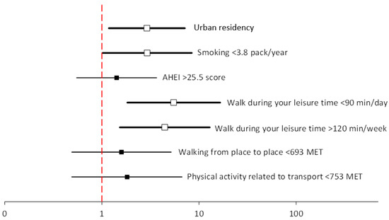 The most significant predictors of successful smoking cessation included the amount of free time spent on walking, fewer pack-years (OR = 2.93; CI = 1.02–8.43), and living in an urban area (OR = 2.91; CI = 1.18–7.16) (Table 6, Figure 4).