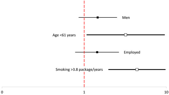 In contrast, the most significant predictors of quitting smoking included the amount of free time, more pack-years (OR = 5.42 CI = 2.50–11.8), age > 61 years (OR = 5.03 CI = 1.75–14.2), status of being employed (OR = 2.20 CI = 1.27–3.79), and male sex (OR = 1.70 CI = 1.02–2.84) (Table 7, Figure 5).