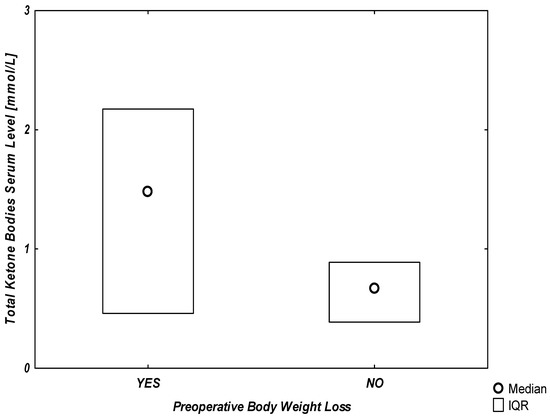 Median total ketone bodies serum levels divided in groups by preoperative body weight loss. Figure 1 Presents the difference between the median and interquartile range of total ketone bodies serum levels between the group with reported preoperative body weight loss and the group without any reports of weight loss. IQR—interquartile range.