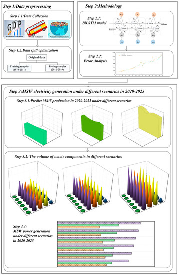 With the growth of the world’s population, economic development and the acceleration of urbanization, Municipal Solid Waste (MSW) has increasingly become a focus of attention [1]. At present, the large amount of MSW and improper disposal are the most challenging environmental problems faced by all countries in the world, and it is also one of the important problems of fine urban management in China. From the source, MSW is collected from household, industrial, commercial buildings and urban sources, and its generation is closely related to human activities [2]. From the perspective of MSW treatment methods, they are landfill, incineration, and composting respectively. In the volume of MSW collected, landfill accounted for 52%, incineration accounted for 45%, and composting accounted for only 3% [3]. It is urgent for China to accurately predict the amount of MSW generated, and then accurately predict the amount of electricity generated by MSW [4]. MSW generating electricity is a form of waste-to-energy (WtE); it can help bridge the gap between sustainable environment and energy supply, reduce the amount of waste sent to landfills, and generate useful electricity at the same time to achieve sustainable urban development.