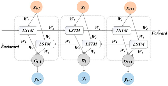 In order to improve the learning ability of the traditional LSTM model, the bidirectional relationship of input data in the time structure is considered, rather than the single direction through the LSTM gate of input processing, and the bidirectional LSTM model fully considers the next information when processing the current time series data. This kind of two-way processing obtains more structural information through the gate mechanism and enhances the method of information intelligence. The BiLSTM model encodes the information in order to obtain the information characteristics of the data before and after, thus improving the generalization ability. The LSTM unit starts from the input sequence, and the inverse form of the input sequence has been integrated into the LSTM network. The BiLSTM model generated by the forward and backward layers is shown in Figure 2. Calculate forward from time 1 to time t in the forward layer to get and save the output of forwarding at each time. Calculate Backward from time t to Time 1 in the backward layer to get and save the output of the backward layer at every moment. Finally, the final output can be obtained at each moment by combining the out put results at the corresponding moments of the forward layer and the backward layer. The mathematical expression is shown in Equations (1)–(3):