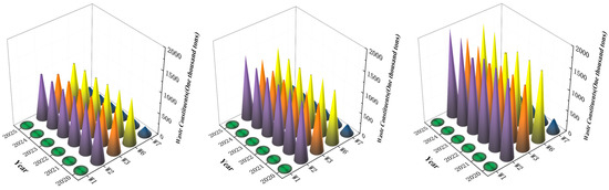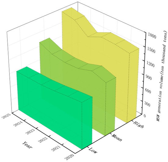 The study sets different scenarios and calculates the value of each index according to different scenarios, then the index data sequence under different scenarios is input into the prediction model to reduce the uncertainty of model prediction. Combined with the historical data of six indicators and the planning of macro-economic, consumption, and population indicators, the characteristics and trends of each indicator are reasonably analyzed, so as to effectively predict the amount of MSW generation. In this study, three scenarios were established based on different economic development conditions to predict the MSW output in Shanghai from 2020 to 2025. Scenario 1 is the low-growth scenario, which will continue to maintain the recent development trend of the country and reasonably calculate the lowest non-negative growth rate of social, economic, and demographic indicators, according to the historical growth rate of data series, to predict the amount of MSW generation in Shanghai. Scenario 2 is the base growth scenario, which is based on the average year-on-year growth rate of each indicator from 1978 to 2018, which is more consistent with the development trend of each indicator feature from 2019 to 2023, so will be more accurate. Scenario 3 is the high-growth scenario, which maintains a high-growth-rate change trend, according to the changes in historical data series. Based on the data characteristics from 1978 to 2018, this study calculates the average year-on-year growth rate of each indicator and increases 1.2-times based on the basis of the average growth rate. The growth rates of data series under different scenarios are shown in Table 6.