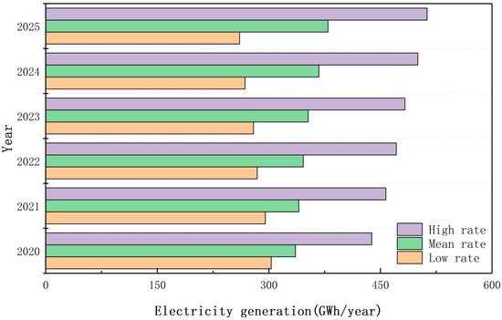 Under the low-growth-rate scenario, Shanghai’s MSW electricity generation shows a downward trend, and its electricity generation decreases from 303.22 GWh in 2020 to 260.67 GWh in 2025. Under the baseline growth rate scenario, the electricity generation of Shanghai MSW remains stable, and the electricity generation of Shanghai MSW fluctuates between 335.73 GWh and 379.47 GWh. Under the high-growth-rate scenario, the electricity generation of Shanghai MSW keeps rising and is expected to decrease by the end of 2023. However, overall, the electricity generation in Shanghai MSW keeps increasing and is expected to reach 512.75 GWh in 2025. These results indicate that MSW electricity generation has great energy potential.