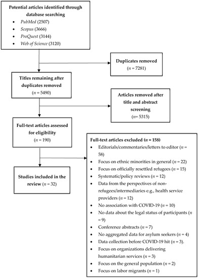 Articles were included in the review if they: (i) examined the perspectives of community-based asylum seekers and undocumented migrants about COVID-19, including its impact; (ii) contained empirical research; (iii) were conducted in high and upper-middle-income countries [21]; and (iv) were published in peer-reviewed journals. Articles were excluded if they: (i) were commentaries, reviews, letters, books or grey literature; (ii) were modelling studies; (iii) focused on permanently and/or officially resettled refugees and migrants; (iv) did not contain data related to pandemic-induced impacts and measures; or (v) were not related to the COVID-19 pandemic. The PRISMA flow diagram (Figure 1) provides reasons for exclusion.
