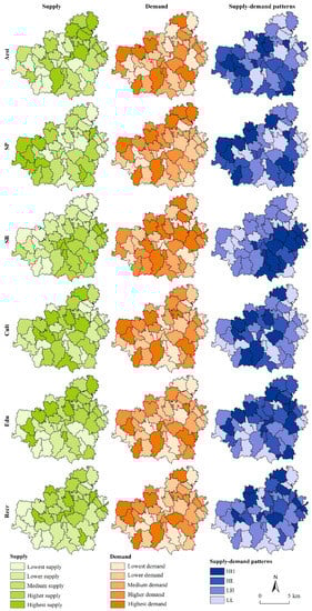 where is the standardized supply index or demand index, is the supply index or demand index of the x-th evaluation village, is the average of all villages, is the standard deviation of all villages and is the total number of villages. The four quadrant diagrams of the six types of CES supply and demand are in available in the Supplementary Material (Figures S1–S6)), and the spatial distributions of the CES supply–demand patterns in Shigou Township are shown in Figure 2 [61,67].