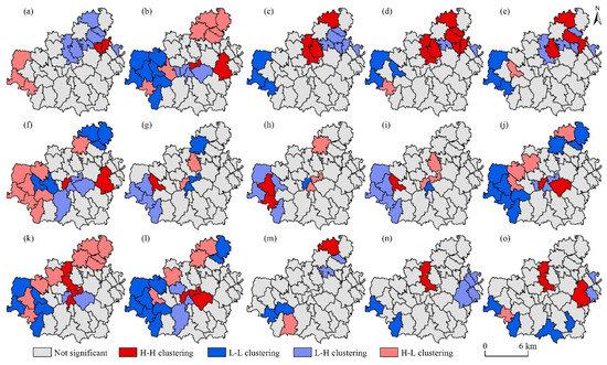 Spatial agglomeration of tradeoffs/synergies between six types of cultural ecosystem services on the supply side. (a): Aest-SP; (b): Aest-SR; (c): Aest-Cult; (d): Aest-Edu; (e): Aest-Recr; (f): SP-SR; (g): SP-Cult; (h): SP-Edu; (i): SP-Recr; (j): SR-Cult; (k): SP-Edu; (l): SP-Recr; (m): Cult-Edu; (n): Cult-Recr; (o): Recr-Edu. Aest: aesthetic; SP: sense of place; SR: social relations; Cult: cultural heritage; Edu: education; Recr: recreation. H-H clustering: high–high clustering; L-L clustering: low–low clustering; L-H clustering: low–high clustering; H-L clustering: high–low clustering.