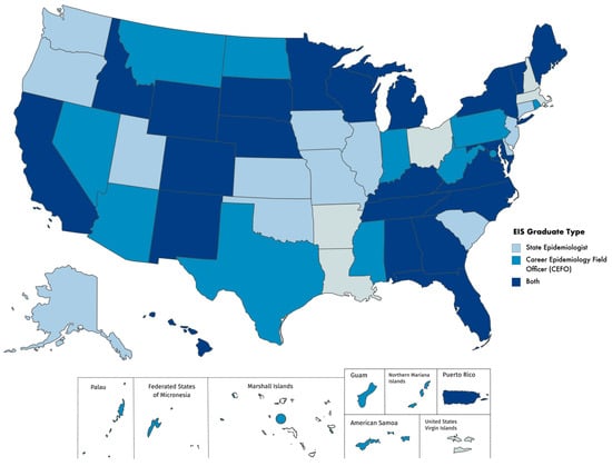 EIS graduates have served as State Epidemiologists and CEFOs throughout the United States, territories, and the District of Columbia during 2000–2016. During this period, 35 states, Puerto Rico, and the U.S. Virgin Islands had a state or territorial epidemiologist who was an EIS alumnus. Thirty-two states, Washington, D.C., Puerto Rico, and the U.S.-affiliated Pacific Islands, had a CEFO who was an EIS alumnus. Twenty-two states and Puerto Rico both had at least one state epidemiologist and at least one CEFO who were EIS alumni during the evaluation period (