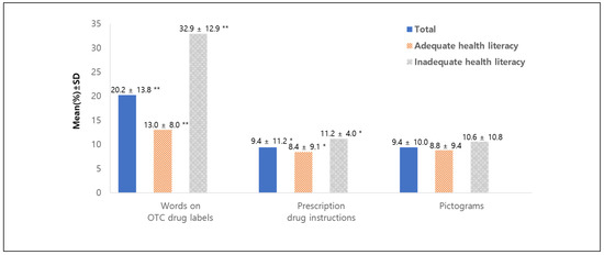 Figure 1. Level of misunderstanding of words on OTC drug labels, instructions for prescription drugs, and pictograms. p-value (* p < 0.05, ** p < 0.001) indicates statistical differences in each variable between adequate health literacy vs. inadequate health literacy groups. Abbreviations: OTC, over the counter; SD, standard deviation.