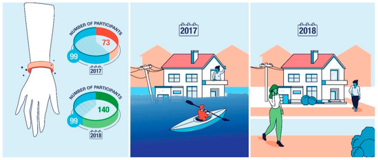 The Houston-3H project consisted of multiple timepoints. The first sampling period hereafter referred to as “post-hurricane” began within one month of Hurricane Harvey, while parts of the Houston MSA were still experiencing flooding, and active flood clean-up was still occurring [40]. The second time point was taken approximately one year after the hurricane in non-disaster conditions and is hereafter referred to as the “estimated baseline”. At both the post-hurricane and estimated-baseline timepoints, participants wore silicone wristbands for seven days, and completed questionnaires related to their demographics and flood-related exposure. Participants were originally recruited from targeted flood-impacted neighborhoods (e.g., Addicks, Baytown, East Houston, and Bellaire-Meyerland) within the Houston metropolitan area in Harris County, TX. Recruitment for the estimated-baseline timepoint consisted of contacting participants from the original time point that had indicated interest in continuing on in the study, and new participants living within the original study neighborhoods were recruited. Inclusion criteria for the study were being at least five years of age and fluent in either English or Spanish, and having given informed consent. Multiple individuals from the same household were allowed to participate in the study. Wristbands were returned between 21 September and 20 October 2017 for the post-hurricane timepoint (n = 172), and between 13 September and 29 October 2018 for the estimated-baseline timepoint (n = 239) (Figure 1). There was a longitudinal panel of 99 participants who had returned wristbands at both time points.