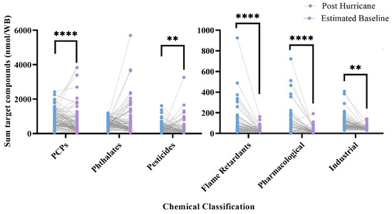 Sum concentration of chemical classifications (i.e., personal-care products (PCPs), phthalates, pesticides, flame retardants, and pharmacological and industrial products) for matched pairs across timepoints. Comparisons represent results from Wilcoxon matched-pair signed-rank tests ** (p < 0.01), **** (p < 0.0001).