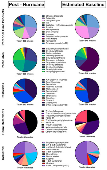 Out of the 162 unique chemicals detected post-hurricane, there were 36 PCPs, 41 pesticides, 14 flame retardants, two pharmacological compounds, four PCBs, 25 PAHs, 10 phthalates, and 30 industrial compounds. Alternatively, the 137 individual chemicals detected at the estimated baseline contained 31 PCPs, 32 pesticides, 11 flame retardants, two pharmacological compounds, one PCB, 14 PAHs, 11 phthalates, one dioxin/furan, and 34 industrial compounds. At both time points, PCPs and phthalates formed the majority of the average total detected chemical exposure. PCPs were the predominant chemical category present post-hurricane, and phthalates were the predominant chemical category at the estimated baseline (Table S11).