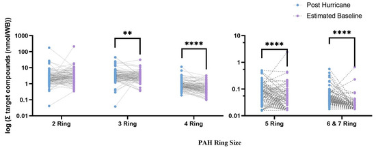 Log scale of sum concentration of PAHs across ring sizes in matched pairs across timepoints. Comparisons represent results from Wilcoxon matched-pair signed-rank tests ** (p < 0.01), **** (p < 0.0001).
