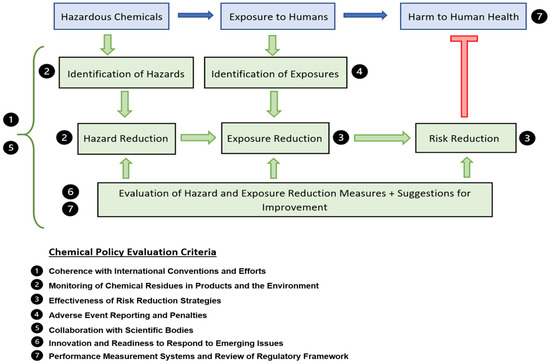 In order to minimize the adverse effects of environmental chemical exposure on human health through policy and regulation changes, we must first examine the sequence and interaction of events leading to human harm. This can be understood qualitatively by extrapolating the health risk assessment schema used by chemical regulators and industry [64,65]. In our model (Figure 1), we describe a sequence starting with the chemical (hazard), leading to the potential for exposure to humans (risk), which may result in human harm (endpoint). This sequence can be prevented or mitigated through several strategies, namely, identification of hazardous chemicals, identification of exposure opportunities, and mechanisms to reduce both. These mechanisms themselves are also subject to evaluation and performance measurement systems to ensure they are effective in reducing risk.