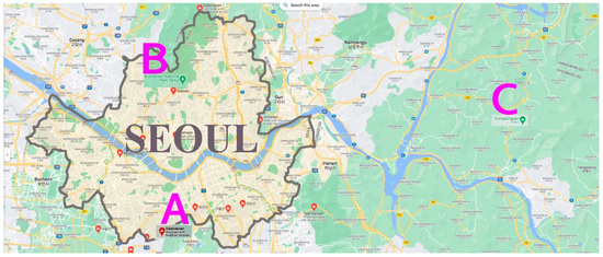 Research sites are located in the suburbs of Seoul. (A) Mt. Gwanak Urban Forest; (B) Mt. Bukhan National Park; (C) Mt. Yumyeong Recreation Forest (https://www.google.co.kr/maps/search/Mountain?hl=en) (accessed on 27 May 2022).