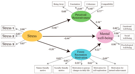 Structural equations are used to verify the stress, perceived restorativeness, motivation for forest recreation, and the mental well-being of forest users.