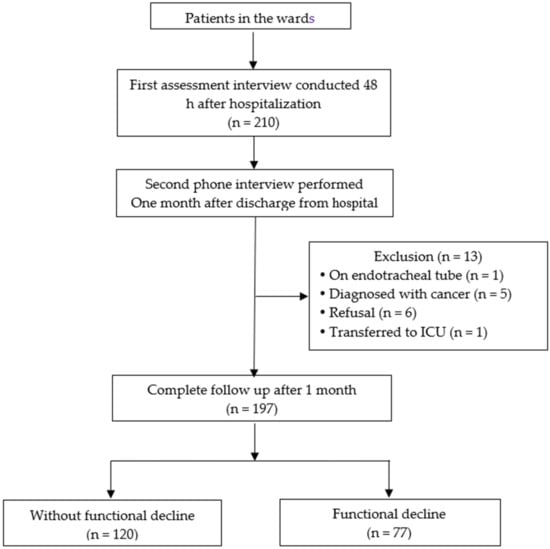 Among the 210 enrolled subjects, one was intubated and unable to communicate, five were diagnosed with cancer, six declined the telephone follow-up, and one was transferred to the intensive care unit due to critical condition, resulting in the withdrawal of 13 subjects (6.2%) from the study. A total of 197 subjects completed the study (Figure 1).