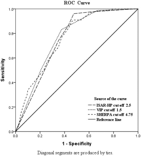 Area under the receiver operating characteristic for ISAR-HP, VIP, and SHERPA.