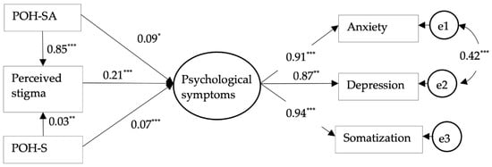The SEM results are shown in Figure 1 and Table 3. According to SEM model fit standards [65,66], the current model yielded a good model fit: 3.57, which falls within the range 2–5. The comparative fit index (CFI) = 0.99 > 0.90, the Tucker–Lewis index (TLI) = 0.98 > 0.90, and the root mean square error of approximation (RMSEA) = 0.03 < 0.05. According to the cutoff values of standardized SEM coefficient [67] p. 208, H1 and H2 were supported in that POH-SA () and POH-S () positively influenced psychological symptoms with a small effect size. Regarding H3, POH-SA () and POH-S () positively influenced perceived stigma, whilst perceived stigma positively influenced psychological symptoms (). Second, according to the cutoff values of the mediation effect size [68], the Monte Carlo method (5000 replications) showed the indirect effects on psychological symptoms of the perceived stigma, mediating the influence of POH-SA in a medium to large effect size ) and POH-S to a small effect size . Thus, H3 was also supported.
