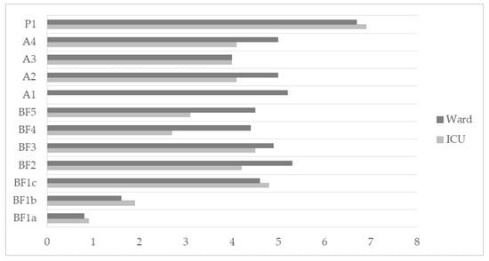 COVID-19 mean symptom intensity at 12 weeks in ICU- and Ward-admitted patients. Legend: BF1 = Breathlessness: (a) at rest, (b) dressing, (c) stairs; BF2 = Fatigue; BF3 = Pain/discomfort; BF4 = Anxiety; BF5 = Depression; A1 = Communication; A2 = Mobility; A3 = Personal Care; A4 = Usual Activities; P1 = Global Health.