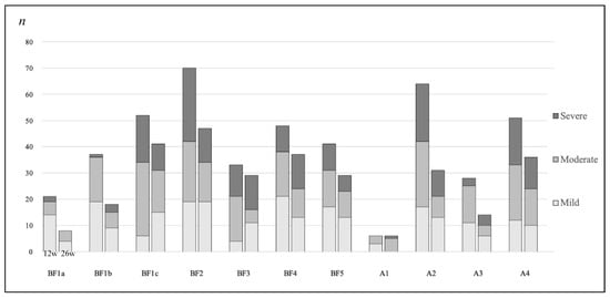 Changes of PCS severity phenotypes (mild, moderate, severe). Legend: BF1 = Breathlessness: (a) at rest, (b) dressing, (c) stairs; BF2 = Fatigue; BF3 = Pain/discomfort; BF4 = Anxiety; BF5 = Depression; A1 = Communication; A2 = Mobility; A3 = Personal Care; A4 = Usual Activities.