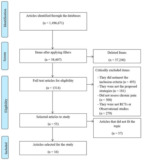 The PECOS framework, as aforementioned, was followed to determine which studies were included in the present systematic review. Each study had to meet the following inclusion criteria:(i) published from January 2015 to March 2022, (ii) published in the English language and internationally peer-reviewed, (iii) classified as RCTs, observational studies, (iv) full text available, (v) adults over 18 years of age, and (vi) participants had to be suffering from chronic musculoskeletal pain for at least 3 months. The exclusion criteria were studies that (i) did not evaluate chronic pain, (ii) did not apply food strategies in people with chronic pain as treatment, and (iii) did not show results or interpretation of their data.