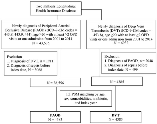 This study had a retrospective cohort study design. The two-study population comprised patients aged ≥20 years, with 43,535 who were newly diagnosed as having PAOD (ICD-9-CM codes: 443.8, 443.9, and 444) or 6932 DVT (ICD-9-CM codes = 453.8) from 2001 to 2014. To ensure accurate diagnosis, outpatient visits ≥ 2 times or hospitalizations ≥ 1 time were stipulated. The index date was the date of the first diagnosis of PAOD or deep vein thrombosis during admission. To reduce the confounding of coexisting disease in each group, there were 41,624 and 4844 patients in this study after excluding patients with diagnoses of DVT and PAOD from the PAOD and DVT groups, respectively. A total of 3068 and 499 patients with a diagnosis of sepsis (ICD-9-CM codes: 038, 995.91, and 995.92) before the index date were excluded; we did so to include only patients with new-onset PAOD or DVT. The outcome variable was a diagnosis of sepsis on hospitalization or a visit to the emergency department. Both groups were followed-up until the onset of sepsis, death, or 31 December 2015, whichever occurred first.
