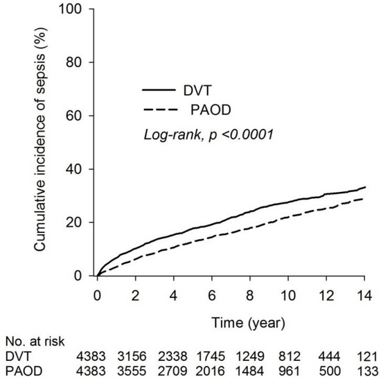 In this study, we enrolled patients with PAOD or DVT from the Longitudinal Health Insurance Database 2000 (LHID 2000) to elucidate the association among sepsis. We hypothesized that DVT compared with PAOD patients would increase the risk of sepsis.