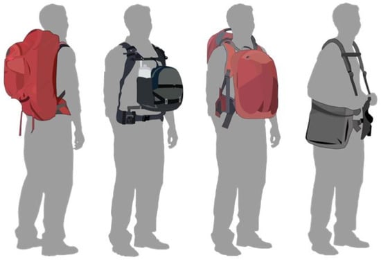 The reviewed articles included both female and male participants belonging to three main groups: schoolchildren, adult hikers/athletes and military personnel. The different typologies of packs are illustrated in Figure 1.