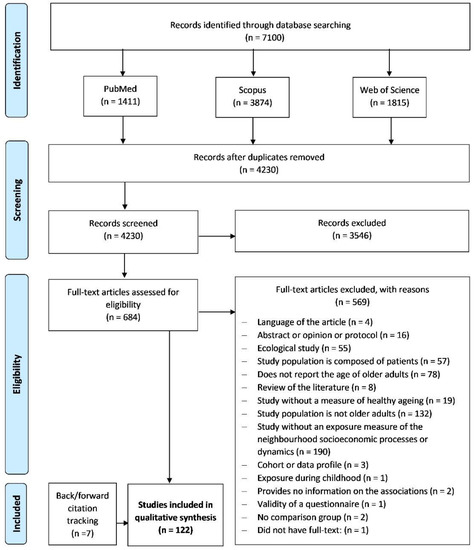All studies conducted on older adults that assessed the association between neighbourhood socioeconomic processes and dynamics and older adults’ healthy ageing were included. The inclusion criteria were based on the WHO definition [8] of healthy ageing, “the process of developing and maintaining the functional ability that enables wellbeing in older age”; and on Diana Kuh and colleagues’ approach [53] that includes healthy biological ageing and well-being. The definition includes not only the “(…) maintenance (…) of optimal physical and cognitive functioning for as long as possible (…)” but also two important components: (1) the survival to old age; (2) the delay in the onset of chronic diseases and disabilities. The following successive exclusion criteria were applied: (1) article type (reviews, editorials, letters, comments, or statements); (2) non-human studies; (3) study design/content (ecological studies, cohort/data profile, or validation of a questionnaire); (4) studies in languages other than English, French, German, Italian, Portuguese, or Spanish; (5) studies without access to full-text; (6) studies without a comparison group; (7) studies where the population is composed of patients or other non-healthy populations exclusively; (8) studies that do not have information on individuals aged 60 years (cut-off for old age by the United Nations [54]) and older; (9) studies not reporting the age of the studied population; (10) studies without an exposure measure of the neighbourhood socioeconomic processes and dynamics such as neighbourhood socioeconomic context, spatial segregation, gentrification, or urban renewal; (11) studies where the exposure was verified during childhood only; (12) studies without a measure of healthy ageing; and (13) studies that do not provide information on the associations of neighbourhood socioeconomic processes and dynamics with healthy ageing.