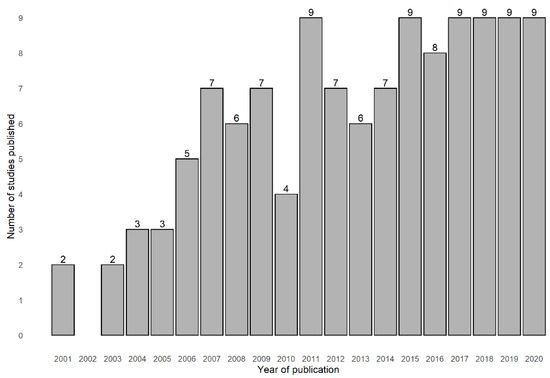 Distribution of the number of studies that assessed the association between healthy ageing and neighbourhood socioeconomic processes and dynamics by year of publication (2001–2020). The year 2021 was not included since the period was not a complete year.