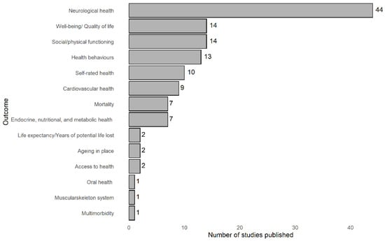 There were quite a few different outcomes related to healthy ageing, namely, neurological health (n = 44), social/physical functioning (n = 14), well-being/quality of life (n = 14), health behaviours (n = 13), self-rated health (n = 10), cardiovascular health (n = 9), endocrine, nutritional, and metabolic health (n = 8), mortality (n = 7), ageing in place (n = 2), life expectancy/years of potential life lost (n = 2), access to health (n = 2), oral health (n = 1), multimorbidity (n = 1), and muscular skeleton system (n = 1).