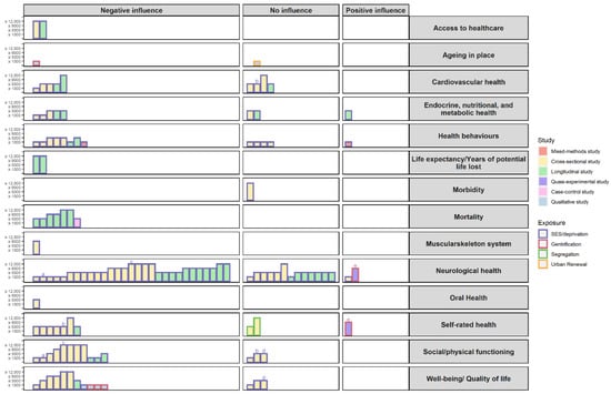 From the included studies, four groups were established to measure the exposure of neighbourhood socioeconomic processes and dynamics, namely neighbourhood socioeconomic deprivation (n = 114), gentrification (n = 5), segregation (n = 2), and urban renewal (n = 1).