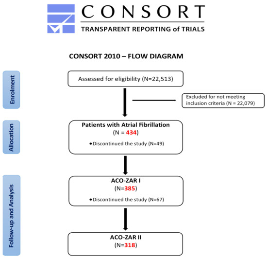 After performing the ACO-ZAR I descriptive study, the ACO-ZAR II study of “Optimisation of oral anticoagulants in primary health care”, in the case of a prospective quasi-experimental study, was carried out on the previous population of the ACO-ZAR I study (385 patients with AF), with the loss of 67 patients due to a lack of follow-up (displacement or death), in the case of a final sample of 318 patients, from June 2016 to July 2017.
