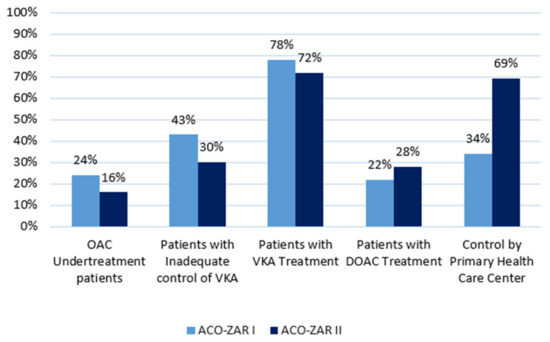 The results of ACO-ZAR II, after implementation of activities aimed at optimizing the management of OAC in primary health care patients, showed an evaluation and registration of risks of 35.5%; undertreatment of 16%; use of antiaggregant drugs of 9%; suboptimal control of VKA of 30%; control by primary health care center of 69.2%; penetrance of DOAC of 28%; and uptake of the follow-up of DOAC in nursing management of 21.9%. A comparison of the results obtained between the assessment of ACO-ZAR I and those obtained for ACO-ZAR II is shown in Figure 2.