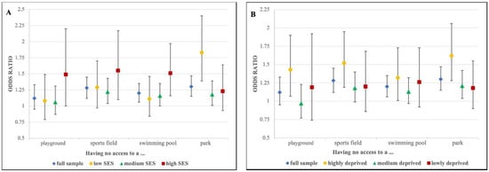 Nevertheless, stratified analyses revealed differences in the association between SI and mental health by individual socioeconomic status (SES) and municipal socioeconomic deprivation (GISD). Low-SES children’s and adolescents’ mental health seemed to suffer more when lacking access to a park, which could not be found in medium- and high-SES children. This corresponds to other studies that stated that the mental health of low-SES children and adolescents from Lithuania, Scotland, England, and the USA benefits more from access to greenspace than mental health of higher-SES ones [,,]. Results of this study underline this trend by yielding higher ORs for children and adolescents from high socioeconomically deprived areas when lacking access to a park or sports field (and to a lesser extent playgrounds) than for the other GISD strata. This common pattern by SES and GISD may be explained by the fact that children and adolescents with low SES are more likely to live in high socioeconomically deprived areas [], to have no garden access [], and to live further away from public greenspace []. Furthermore, those without garden access are more likely to live in a home environment with little total natural space and in high socioeconomically deprived areas [] which are, in turn, less likely to have many public greenspaces [] or natural spaces []. Interestingly, access to sports fields is associated with mental health in medium- and high-, but not low-SES children and adolescents and, simultaneously, in those living in high socioeconomically deprived but not medium or low deprived municipalities. Moreover, swimming pools and playgrounds are more strongly associated with mental health in high-, but not low- or medium-SES children and adolescents. The general low ORs in children and adolescents with medium SES and in those living in medium deprived municipalities may be due to the interplay between individual and area SES. A huge discrepancy between individual and area SES was shown to be detrimental to mental health []. In contrast, socioeconomically heterogeneous neighborhoods, which might be more likely to be found in medium deprived areas and around medium SES children and adolescents, have a beneficial influence []. This might explain the high ORs in high SES children and adolescents, as lacking access to a playground, sports field, and swimming pool is rare in this group and may lead more easily to a feeling of exclusion than in low-SES children and adolescents for whom it is more common to have no access to such places.