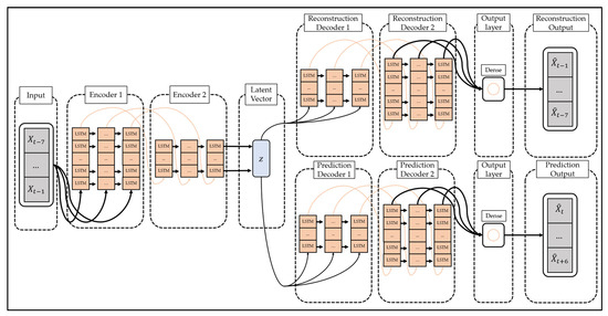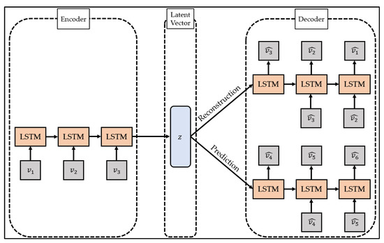 The LSTM-Autoencoder consists of the encoder, reconstruction decoder, and prediction decoder. The encoder creates latent vectors by compressing time series data, the reconstruction decoder reconstructs them in reverse order, and the prediction decoder predicts future values from latent vectors. Unlike a general decoder, the reconstruction decoder reconstructs the input time series data in the reverse order. This is because low-range correlation is considered by reconstructing input time series data in reverse order, which makes optimization easier [51]. The LSTM-Autoencoder consists of one encoder and two decoders and has a structure different from that of general autoencoders. This is to overcome the limitations that may occur when the reconstruction decoder and the prediction decoder are trained [51]. If only the reconstruction decoder is trained, one limitation will be that overfitting may occur by preserving even trivial information from the time series data to generate a latent vector. In addition, when only the prediction decoder is trained, learning proceeds using only the latest information of the time series data, which may pose a problem since information from the past cannot be utilized. The LSTM-Autoencoder induces the model to store important information in the latent vector by simultaneously learning the reconstruction decoder and the prediction decoder and induces learning of information at all points in time series data.