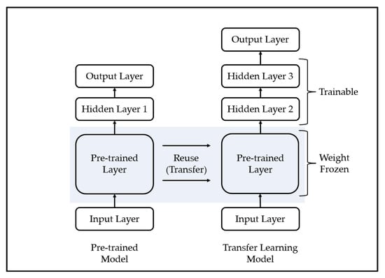 Transfer learning is a methodology applied to similar fields by using a model trained in a specific field and is mainly used for efficient training of deep learning models. A deep learning model is a methodology of predicting the future by modeling a pattern from training data, which is past data, and has been used in various fields with sufficient training data and generally demonstrated excellent performance [57]. However, one limitation of this methodology is that it yields poor performance when high-quality training data are not sufficiently collected, because it is difficult to model the complex pattern of the training data if high-quality training data are insufficient. To overcome these limitations, some recent studies have used transfer learning. The transfer learning methodology is shown in Figure 3.