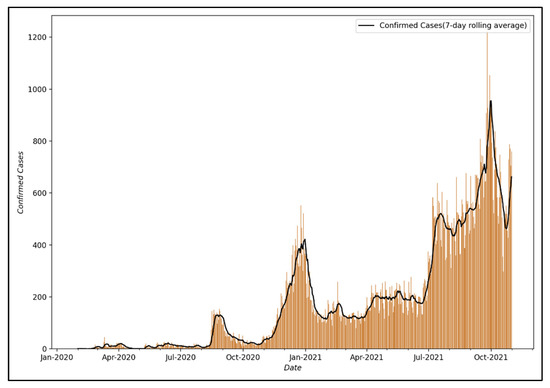 This study used data on the daily number of confirmed COVID-19 cases by city and province provided by the Ministry of Health and Welfare of the Republic of Korea [58]. Among these data, Seoul was selected as the target city for analysis to perform modeling. It was judged that the data from Seoul were representative since Seoul is the capital of the South Korea and its commercial and residential districts are dense, with a large floating population vulnerable to infectious diseases, and the number of confirmed cases in Seoul has been increasing recently. Figure 4 shows the visualization of the number of confirmed COVID-19 cases from 24 January 2020, when the first confirmed case occurred in Seoul, to 31 October 2021.