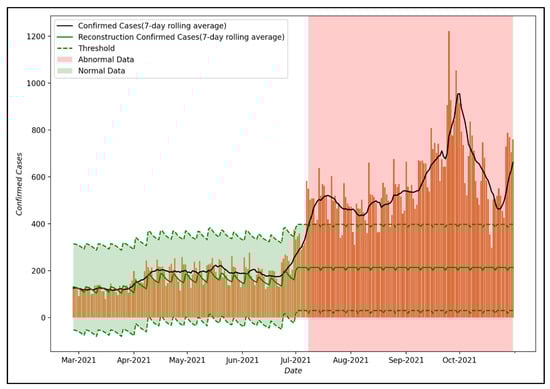 Figure 8 shows the results of anomaly detection using the reconstruction decoder of the LSTM-Autoencoder model proposed in this study. As for the threshold, which is a measure to distinguish normal data from abnormal data, the maximum loss value of training data was used as in Equation (3). This can be interpreted as part of the effect of PHSMs, which the proposed LSTM-Autoencoder could not model when training the COVID-19 spread trend that reflected the effect of PHSMs. In this study, it is assumed that the effect of PHSMs varied when a larger error occurs compared to the threshold.