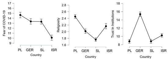 Trust in institutions was significantly higher in Germany compared to Poland (d = 0.93, p < 0.001), Slovenia (d = 0.93, p < 0.001), and Israel (d = 0.37, p < 0.001). The effect size for all countries was large. Trust in institutions was higher in Israel compared to Poland (d = 0.20, p = 0.006) and Slovenia (d = 0.20, p = 0.007), although the effect size was small. Similar mean scores were noted in Poland and Slovenia (p > 0.05). Therefore, the highest trust in institutions was reported in Germany and the lowest in Poland and Slovenia. The details for between-subjects comparison of fear of COVID-19, religiosity, and trust in institutions across countries (Poland, Germany, Slovenia, and Israel) are presented in Figure 2.