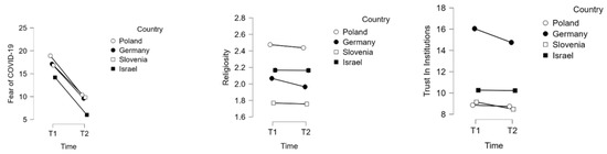 Trust in institutions dropped significantly over time in Germany (d = −0.18, p < 0.001), although the effect size was very small. There were no other significant differences between T1 and T2 in Poland (p > 0.05), Slovenia (p > 0.05), and Israel (p > 0.05). The participants from Germany scored significantly higher compared to Poland (d = 1.01, p < 0.001), Slovenia (d = 0.97, p < 0.001), and Israel (d = 0.82, p < 0.001), with a large effect size at T1. Similarly, the scores were the highest in Germany at T2 compared to the other countries: Poland (d = 0.85, p < 0.001), Slovenia (d = 0.90, p < 0.001), and Israel (d = 0.64, p < 0.001). However, the difference between Germany and Israel was medium at T2, while it was large at T1. The effect size for the difference between Germany and Poland and Israel was large at both T1 and T2. The details of the interaction between time and country with regard to fear of COVID-19, religiosity, and trust in institutions are presented in Figure 3.