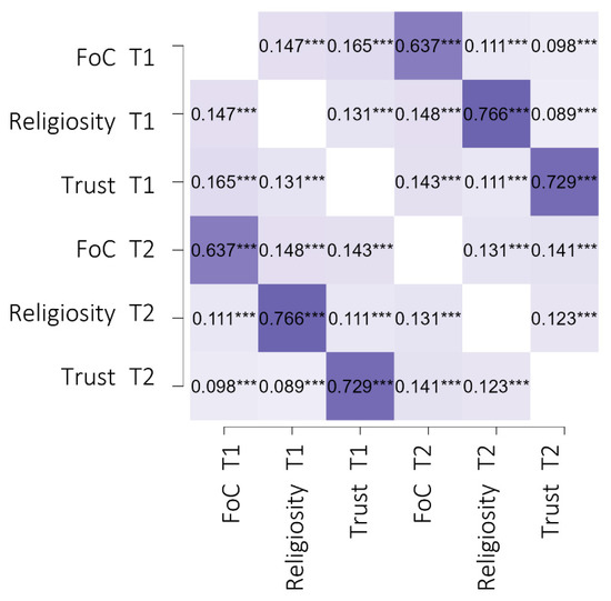 Heat map of the correlational matrix for fear of COVID-19 (FoC), religiosity, and trust in institutions (Trust) at T1 and T2 among young adults (N = 1723). T1, the first measurement in February 2021; T2, the second measurement in May–June 2021. Light violet indicates a small effect size; dark violet represents a large effect size. *** p < 0.001.